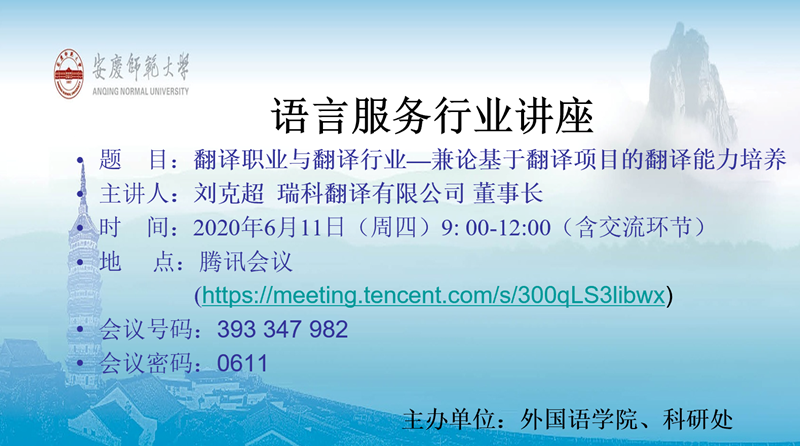 2020年6月11日上午,瑞科翻译公司创始人刘克超应邀通过腾讯会议方式为安庆师范大学翻译和MTI专业相关师生开展了有关翻译职业与翻译行业的讲座。