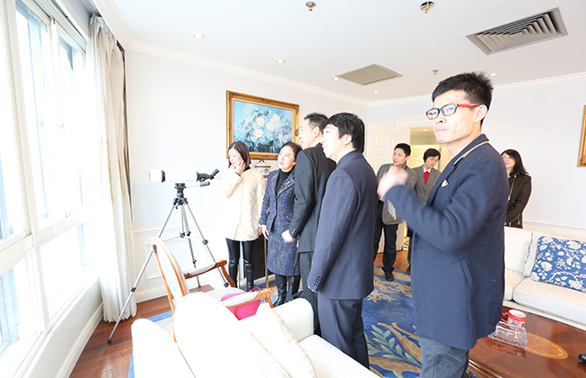 瑞科翻译公司总经理、语资网秘书长左仁君在瑞科办公室向嘉宾介绍对面的黄浦江风光