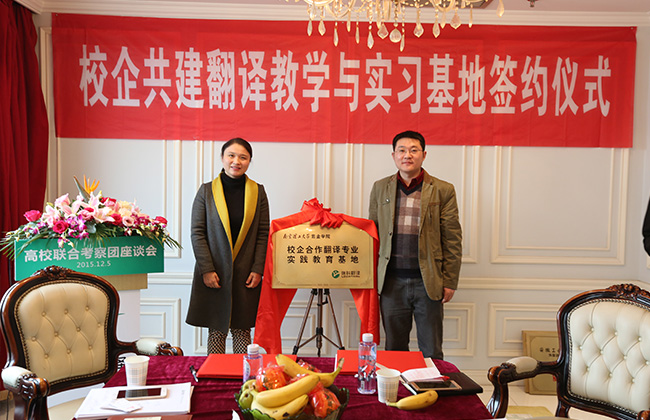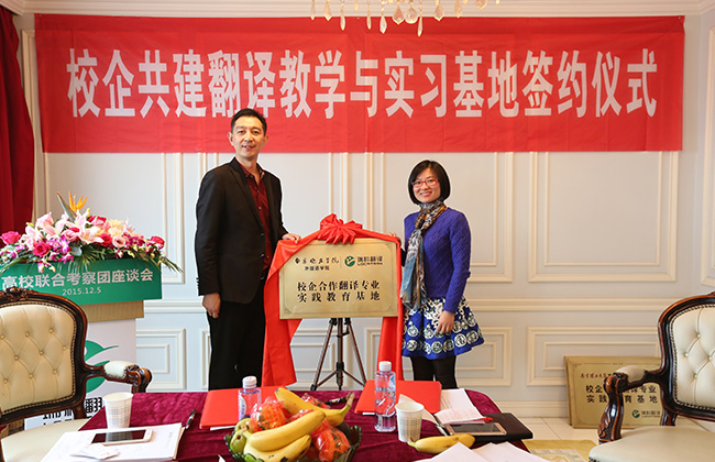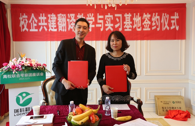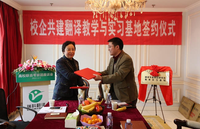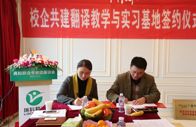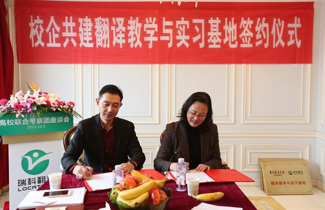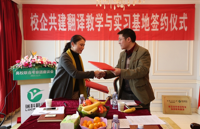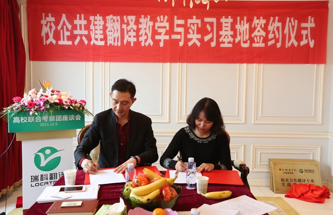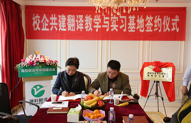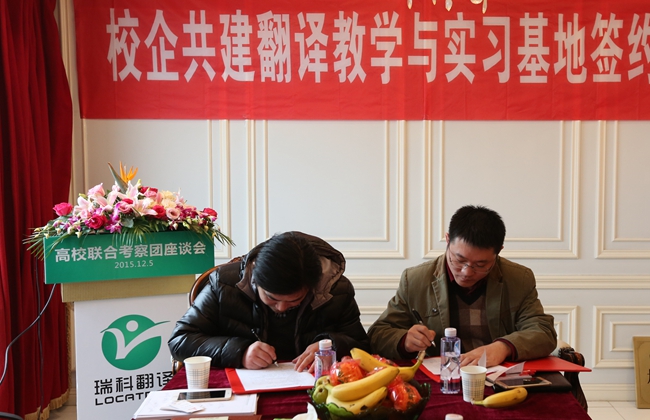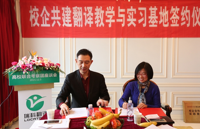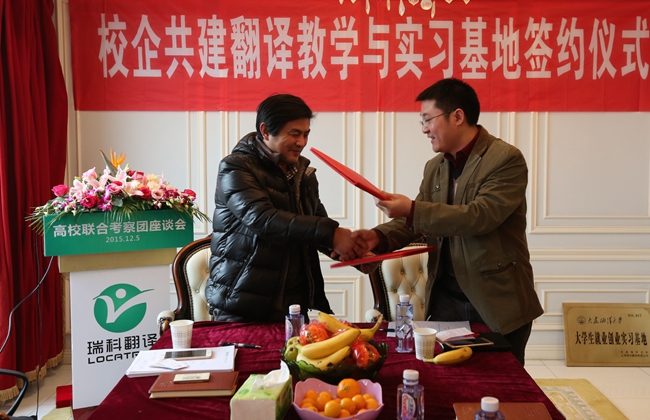 2015年12月5日,来自大连海洋大学、南京林业大学、安徽工业大学、上海师范大学、南京晓庄学院、南京理工大学紫金学院等六所高校的外国语学院院长、翻译专业硕士 (MTI) 负责人、翻译专业负责人以及相关院系领导班子成员组成的高校联合考察团齐聚位于黄浦江畔的上海瑞科翻译公司,探讨校企合作新模式,签署校企合作人才培养协议。语言服务企业负责人、语资网理事单位成员代表、MTI 学生代表、Ledge亮剑英语和口语俱乐部等也应邀出席,参与校企研讨,并开展了相关翻译技术讲座。