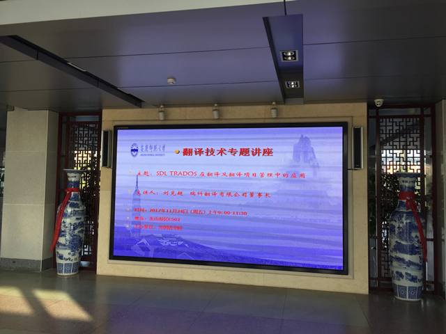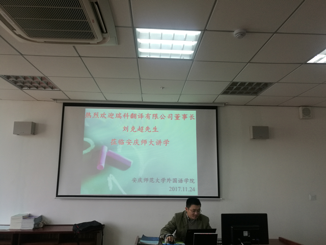 11月7日和11月24日,瑞科翻译公司董事长刘克超先生应邀分别前往上海师范大学天华学院以及安庆师范大学外国语学院,给翻译专业的同学们做了两场有关翻译技术专题的讲座。对于本科同学们来说,在校期间主要还是学习语言基础知识和相关翻译理论,对于翻译技术了解和掌握还是不多,但同学们对于翻译技术知识都表现出了极大的热情,他们深知,CAT及其译前、译中和译后的相关翻译技术在提高翻译工作效率以及翻译质量方面起到非常重要的作用,对于他们日后从事翻译职业至关重要。深入简出的讲座受到同学们的热烈欢迎。