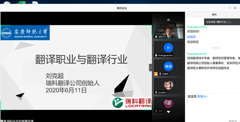 2020年6月11日上午,瑞科翻译公司创始人刘克超应邀通过腾讯会议方式为安庆师范大学翻译和MTI专业相关师生开展了有关翻译职业与翻译行业的讲座。